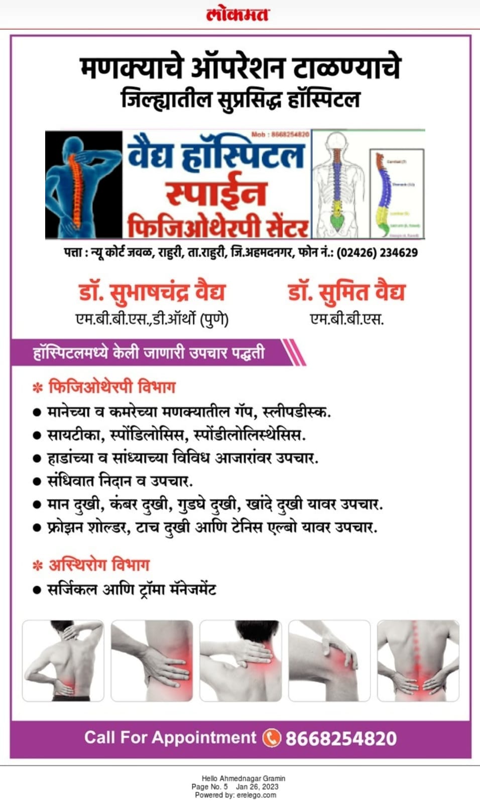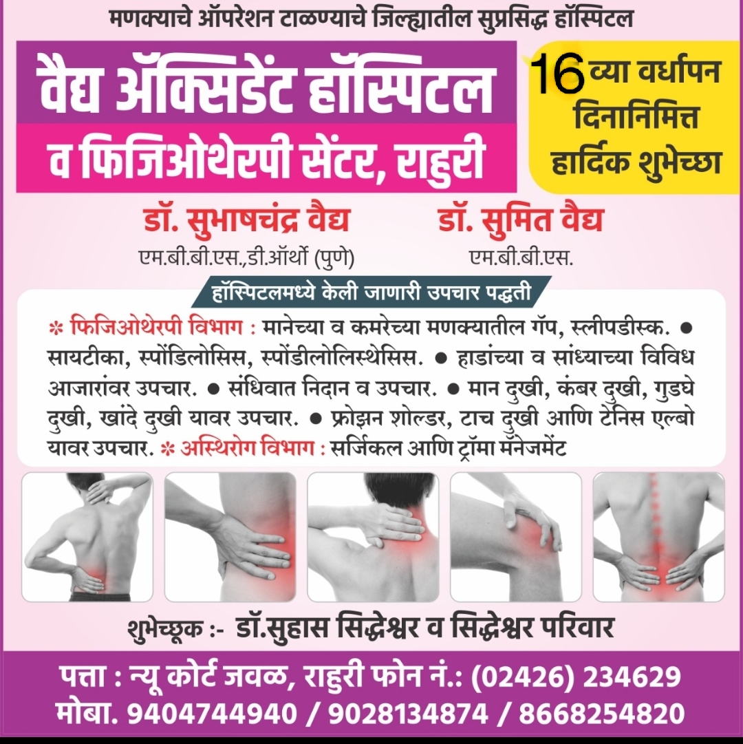 Hospital history: Initially the hospital started as small nursing home with 4 beds in year May 2005. Soon with good response and patients blessing we could start new construction and shortly we shifted at our own Hospital on 5 August 2012 with better and advanced facilities at Rahuri. We believe in the conserving anatomy and physiology of spine with advised treatment
